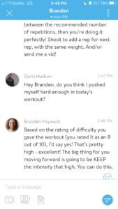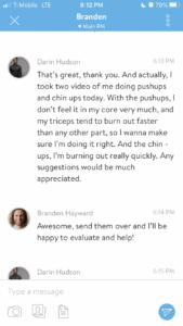 7. I will assess your weightlifting and exercise execution, via videos that you send me. I will provide feedback, modifications, and coaching – through the app, in writing – on your form, pace and execution. There is no limit on the number of exercises you may send in and receive my assessment on. The process of sharing videos with me is easy (even for a non-tech-savvy person like myself), and can be completed in the Trainerize app.